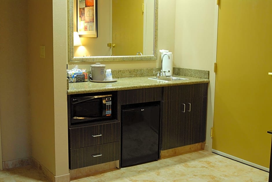 Spacious suite with a large seating area with sofa bed, refrigerator and microwave